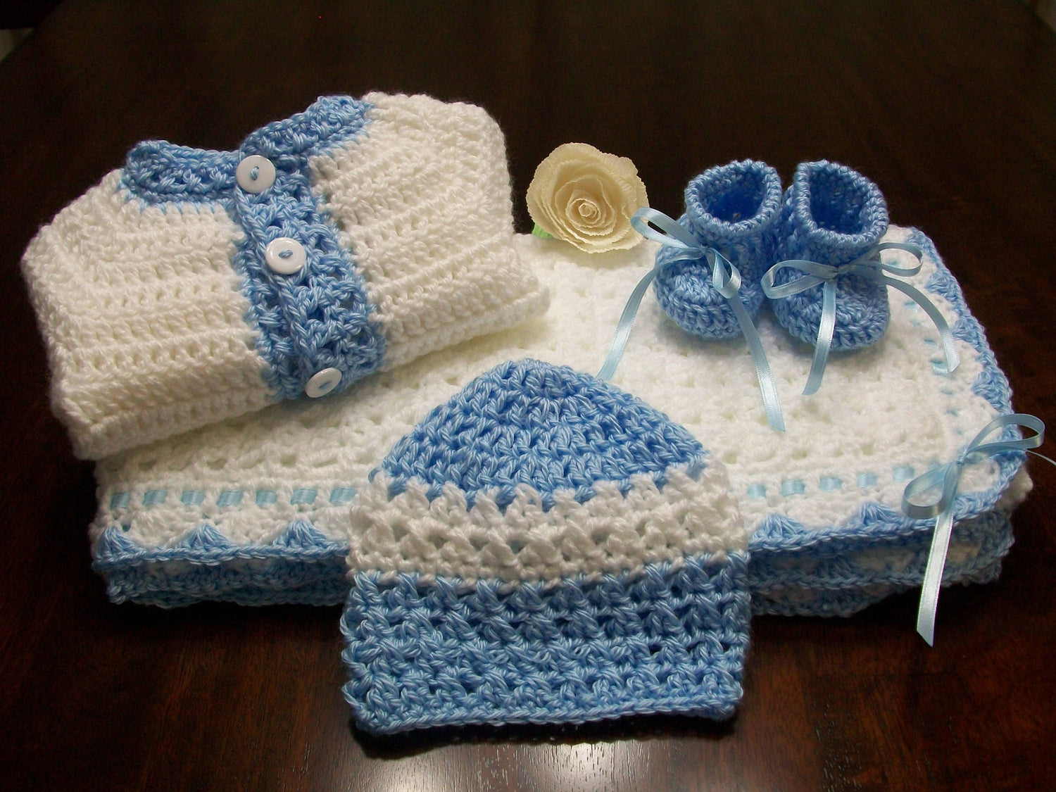 If you're looking for outfits for your baby, look no further with our baby sets that include a sweater, blanket, booties and hat.